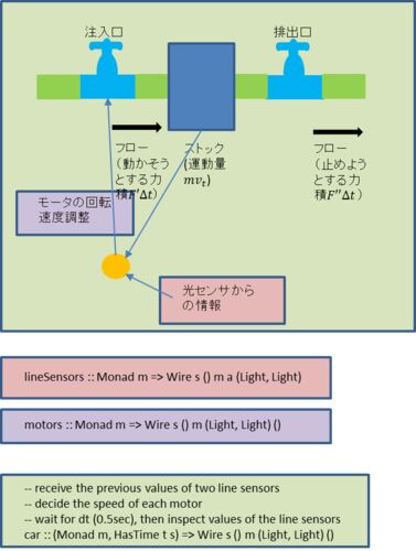 5.Netwireに実装する システム図ができたので、その要素をWireとして定義すればよい。上の図で、ストックは、運動量、フローは力積であった。運動量の不足と過剰(ライントレースカーが黒い線から外れようとしている)を知らせてくれるのが光センサであっ…