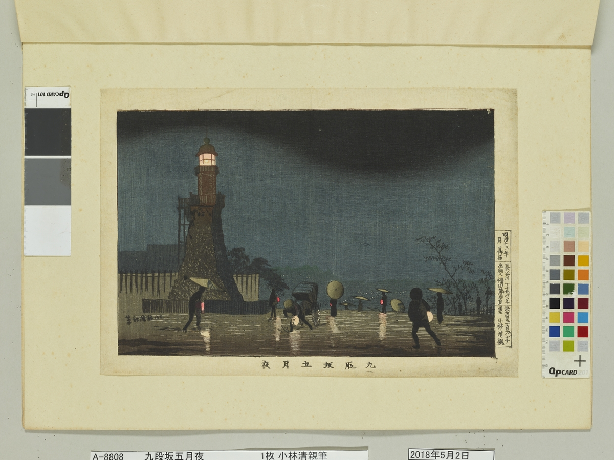 これは夜を表現したもので、「九段坂五月夜」(東京国立博物館)である。江戸時代は夜ともなると真っ暗になるので、浮世絵での夜の表現はほとんど見られない。それに対して明治時代になるとガス灯や電気がともるようになり、夜の景色も表現の対象となる。九段坂上に靖国神社が建てられ、その2年後にその正面に高灯龍が立てられた。そこでの夜の場面で、しとしとと雨が降り、灯籠の明かりが濡れた路面に揺らぎ、その中を人が忙しそうに行き交っている。彼の光線画の特徴がよく活かされている絵と言えるだろう。
