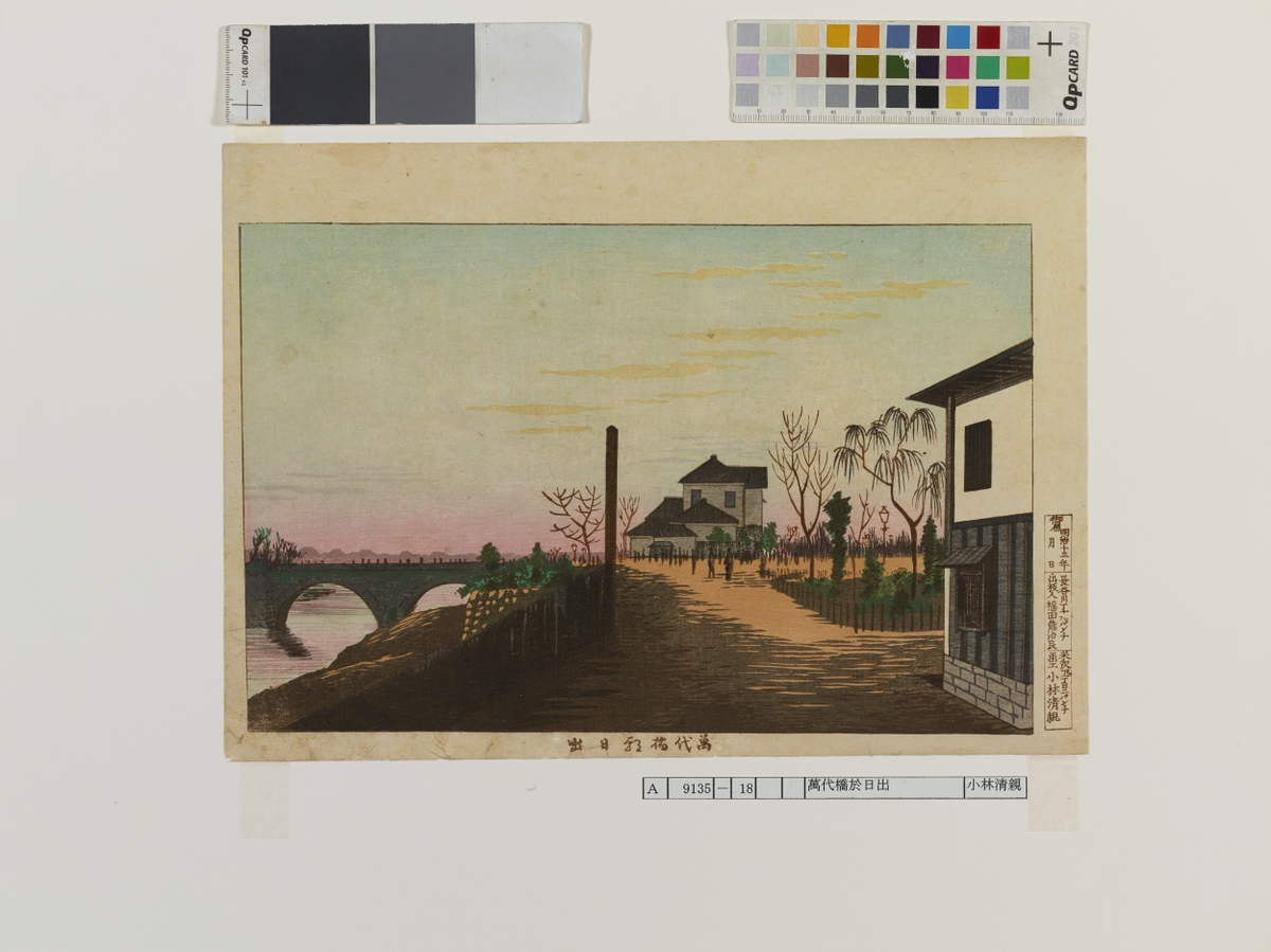 東京風景の出版は、明治14年(1881)に打ち切り、社会風刺画を多く描いてジャーナリズムとの関係を深めた。明治27年(1894)に日清戦争が始まると戦争画を手掛け、世相に応じた浮世絵師として仕事を続けたが、木版の衰退という大きな流れの中で、出版から手を引いていった。50歳を過ぎたころからは肉筆画で腕を振るった。彼は「最後の浮世絵師」とも「明治時代の広重」ともいわれている。